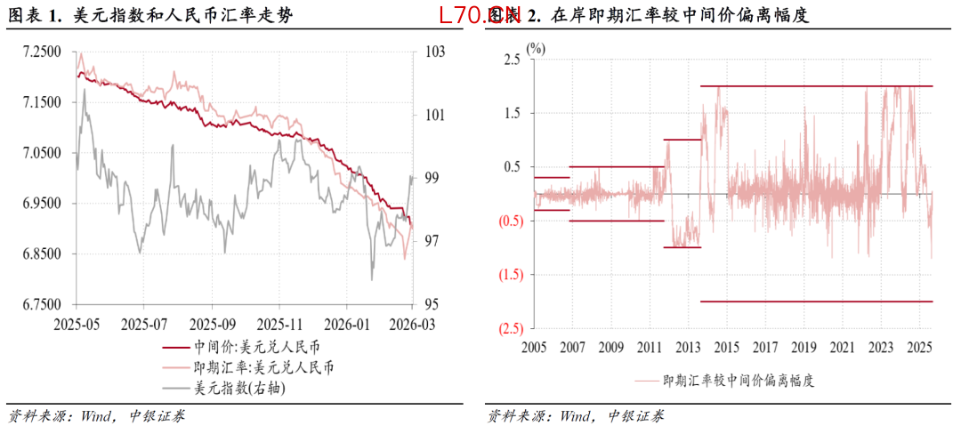 2月末,中东地缘政治紧张局势升级促使美元指数从震荡转为上行,全月累计上涨0.5%至97.6,结束了此前月度“三连跌”。在美元指数反弹背景下,人民币汇率升值行情延续(见图表1)。人民币汇率中间价持续走强,月末升至6.9228,为2023年5月12日以来新高。在岸人民币汇率交易价升值加速,继上年末升破7.0之后,2月12日盘中进一步升破6.90,春节假期过后仅用三个交易日(2月24日至26日)从6.9114最高升至6.8310,创2023年4月17日以来新高。2月26日,在岸即期汇率(境内银行间市场下午四点半交易价,下同)与中间价偏离幅度扩大至-1.2%,为2014年3月17日人民币对美元交易价每日浮动幅度由1%扩大至2%以来新高[1](见图表2)。