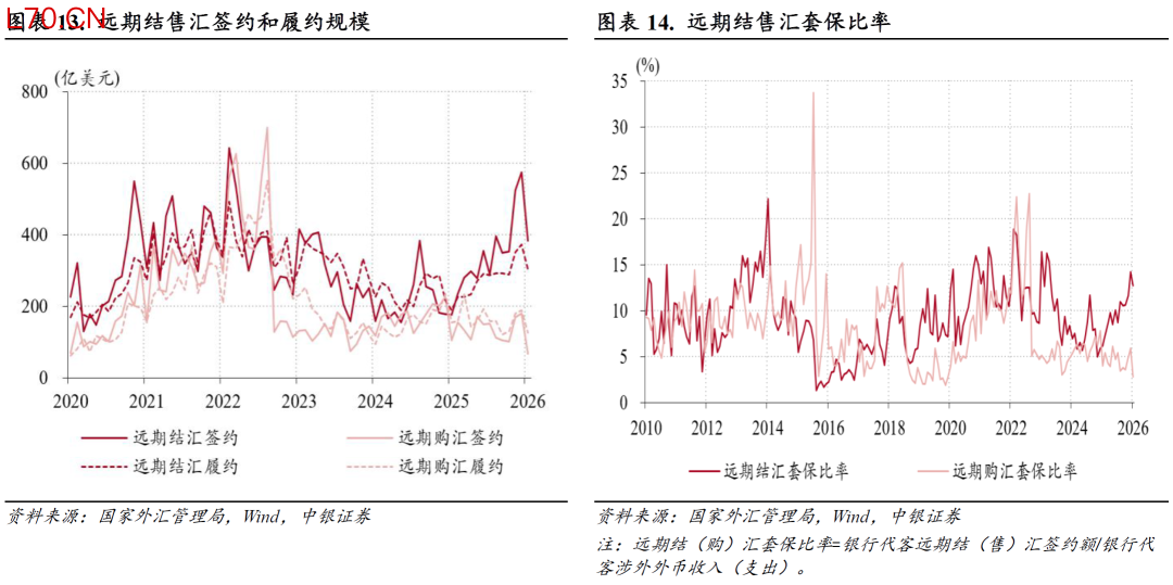 当月,银行代客远期净结汇累计未到期额连续第八个月上升,月末升至1070亿美元,创历史新高(见图表12)。这主要是因为远期结汇需求偏强,远期购汇需求进一步减弱:远期结汇签约规模从上月历史次高574亿降至383亿美元,远期结汇套保比率环比回落1.5个百分点至14.2%,但二者均处于近年来高位;远期购汇签约规模环比减少113亿至67亿美元,远期购汇套保比率回落3.1个百分点至2.8%,二者同时刷新2020年2月以来新低(见图表13、14)。