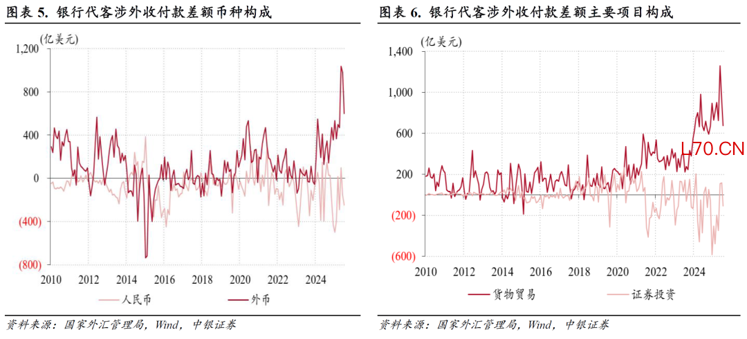 分项目看,货物贸易涉外收付款顺差环比减少237亿至678亿美元,为历史同期新高,证券投资涉外收付款由此前两个月顺差转为逆差110亿美元(见图表6),二者分别贡献了银行代客涉外收付款顺差环比降幅的51%、48%;直接投资、服务贸易、收益和经常转移涉外收付款逆差则相对平稳,环比分别增加33亿、减少24亿和22亿美元。