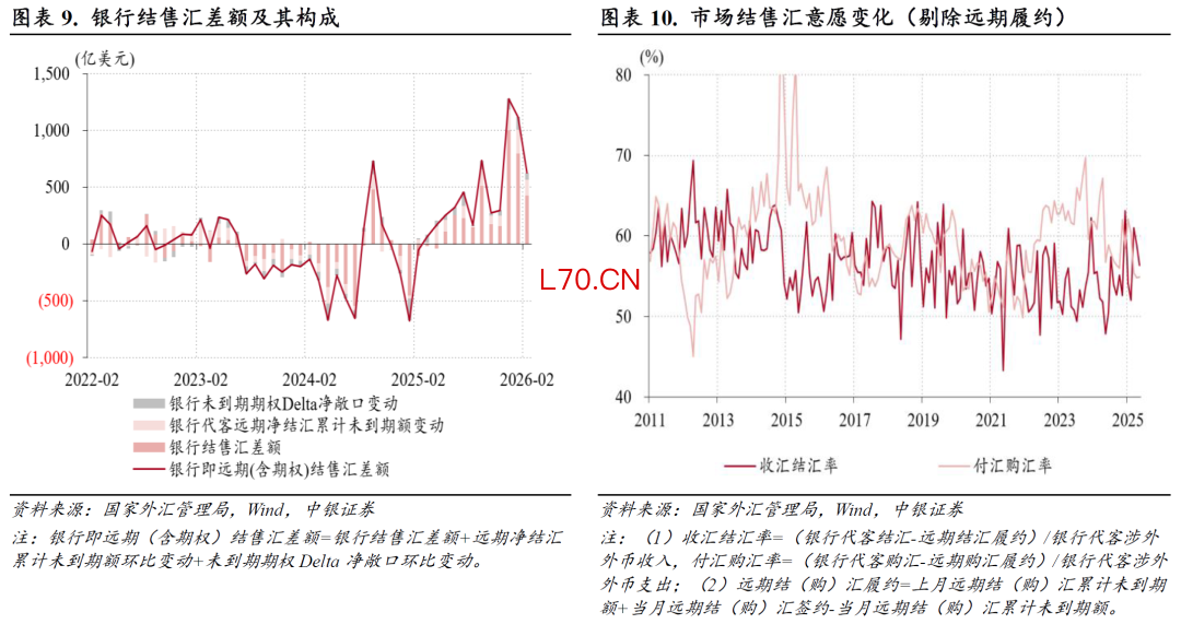 当月,银行代客结售汇顺差由上月888亿降至552亿美元,位列历史第八;远期和期权净结汇规模由上月320亿降至199亿美元;银行自身结售汇逆差由上月89亿增至124亿美元;三者分别贡献了银行结售汇顺差环比降幅的68%、25%和7%(见图表9)。