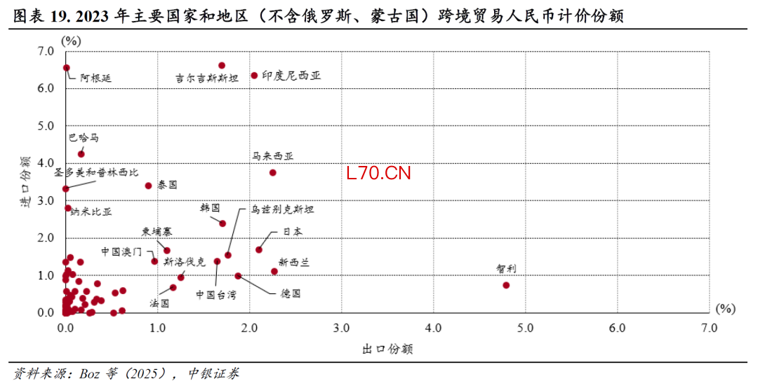 专题:进一步提高本币计价占比,规避汇率波动对企业的财务冲击。近年来,我国跨境贸易人民币结算份额上升,但根据Boz等(2025)统计,少数国家跨境贸易人民币计价份额较高,全球人民币计价份额却仍远低于美元和欧元,我国跨境贸易人民币计价份额也显著低于人民币结算份额。为防范人民币升值对出口企业可能带来的财务冲击,需要持续引导企业进一步提高跨境贸易人民币计价占比。