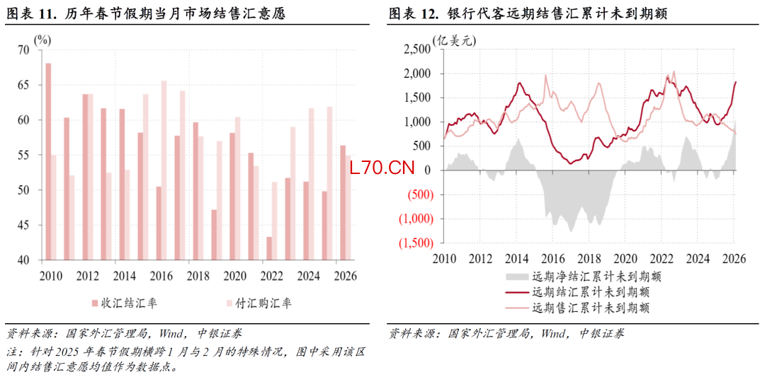 当月,剔除远期履约额后的收汇结汇率连续第二个月回落,环比下降2.5个百分点至56.4%,付汇购汇率环比仅上升0.1个百分点至54.9%,显示随着人民币升值加速,市场结汇意愿减弱、购汇动机稳定。但收汇结汇率和付汇购汇率分别是近三年同期新高、近四年同期新低,并且付汇购汇率连续第三个月小于收汇结汇率(见图表10)。为剔除春节假期效应,对比历年春节假期当月市场结售汇意愿发现,今年2月份收汇结汇率创近六年同期新高,付汇购汇率仍然是近四年同期新低(见图表11)。