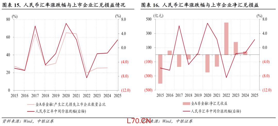 长期以来,大家普遍认为,升值是好事,贬值是坏事。然而,从A股非金融企业汇兑损益情况看,在人民币汇率升值幅度较大的2017年、2020年,分别有63.4%、65.1%的上市企业产生汇兑损失,汇兑收益和汇兑损失的公司轧差合计分别产生净汇兑损失168亿和246亿元人民币;在人民币汇率贬值幅度较大的2016年、2022年,分别有58.9%、64.0%的上市企业产生汇兑收益,合计分别产生净汇兑收益54亿、451亿元人民币(见图表15、16)。