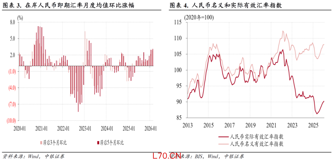 当月,国际清算银行(BIS)公布的人民币名义有效汇率指数延续了2025年8月份以来的升值行情,影响出口竞争力的实际有效汇率指数则延续了2025年7月以来升势,2月份升至90.2,较2025年6月低点反弹了4.6%,使得2022年4月以来的人民币实际有效汇率累计跌幅由最多18.9%收敛至15.2%(见图表4)。