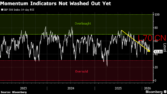 动能指标同样释放出谨慎信号。标普500的相对强弱指数(RSI)数月来持续下行,目前在43附近徘徊。尽管仍高于30这一传统超卖阈值,但这意味着在市场情绪触底前,股价仍有进一步下跌空间。