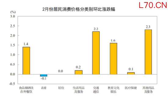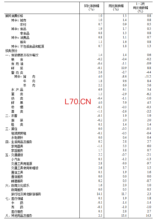 2月份,全国居民消费价格环比上涨1.0%。其中,城市上涨1.0%,农村上涨0.7%;食品价格上涨1.9%,非食品价格上涨0.8%;消费品价格上涨0.8%,服务价格上涨1.1%。