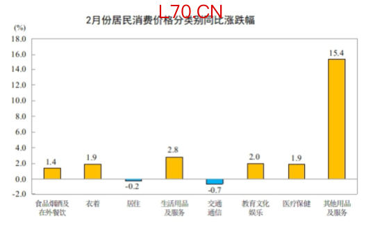 2月份,食品烟酒及在外餐饮类价格同比上涨1.4%,影响CPI(居民消费价格指数)上涨约0.41个百分点。食品中,鲜菜价格上涨10.9%,影响CPI上涨约0.19个百分点;水产品价格上涨6.1%,影响CPI上涨约0.11个百分点;鲜果价格上涨5.9%,影响CPI上涨约0.12个百分点;蛋类价格下降2.9%,影响CPI下降约0.02个百分点;畜肉类价格下降2.7%,影响CPI下降约0.11个百分点,其中猪肉价格下降8.6%,影响CPI下降约0.17个百分点。