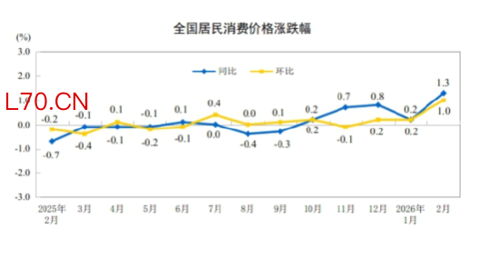 2026年2月份,全国居民消费价格同比上涨1.3%。其中,城市上涨1.4%,农村上涨0.9%;食品价格上涨1.7%,非食品价格上涨1.3%;消费品价格上涨1.1%,服务价格上涨1.6%。1—2月平均,全国居民消费价格比上年同期上涨0.8%。