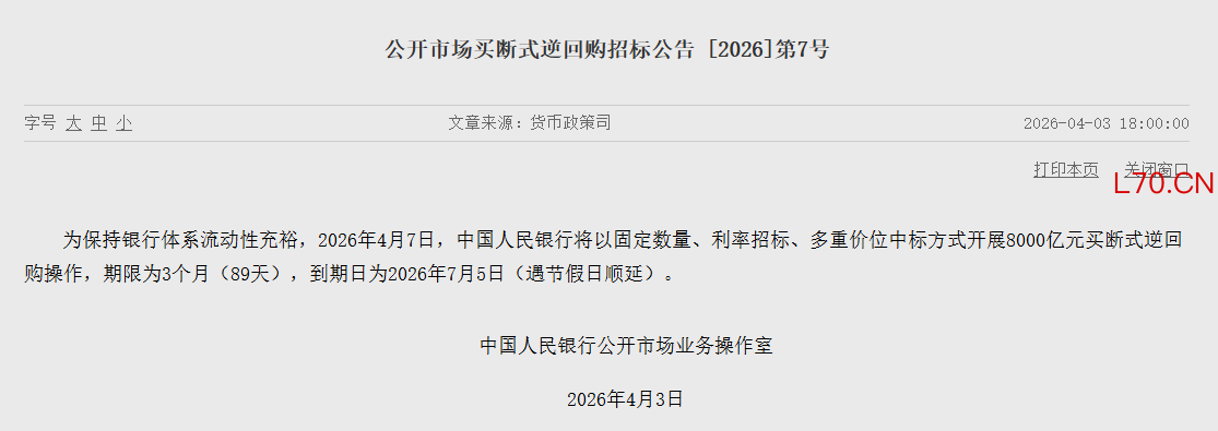 央行:4月7日将开展8000亿元买断式逆回购操作 期限为3个月央行:4月7日将开展8000亿元买断式逆回购操作 期限为3个月