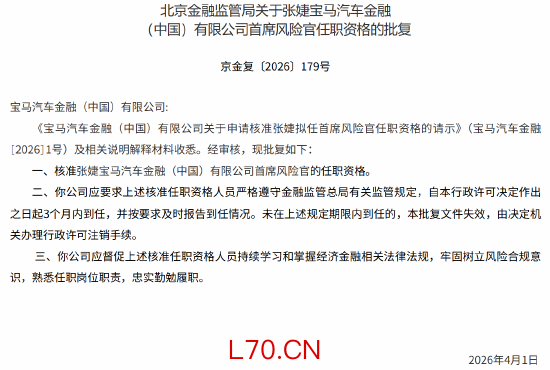 4月3日金融一线消息,北京金融监管局网站发布批复,核准张婕宝马汽车金融(中国)有限公司首席风险官的任职资格。