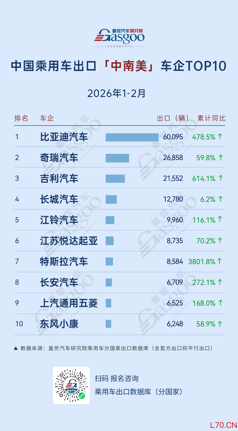 NO.6 江苏悦达起亚。2026年1-2月,向中南美出口8,735辆,累计同比增加70.2%。