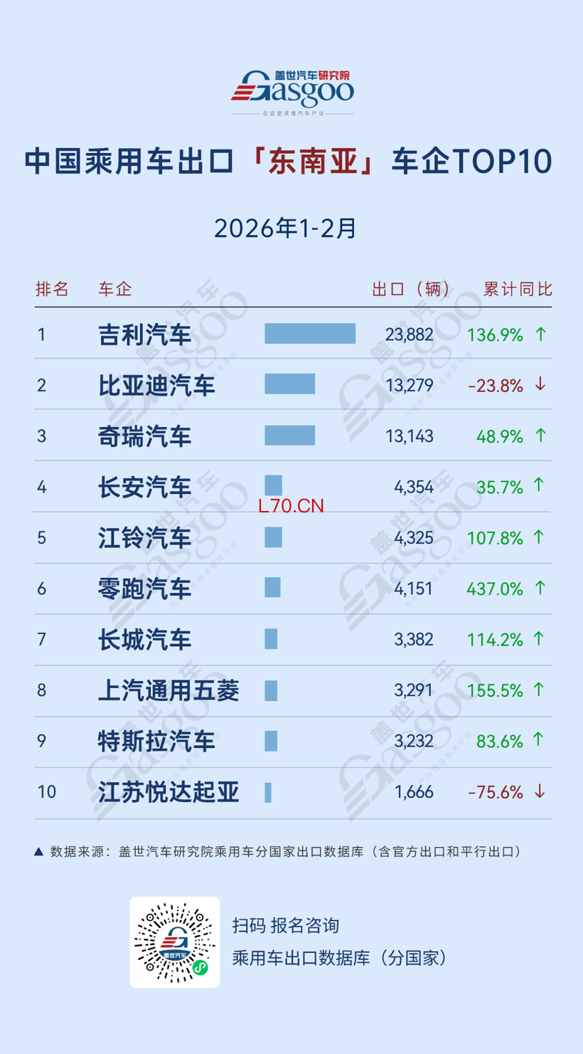 NO.1 吉利汽车。2026年1-2月,向东南亚出口23,882辆,累计同比增加136.9%。