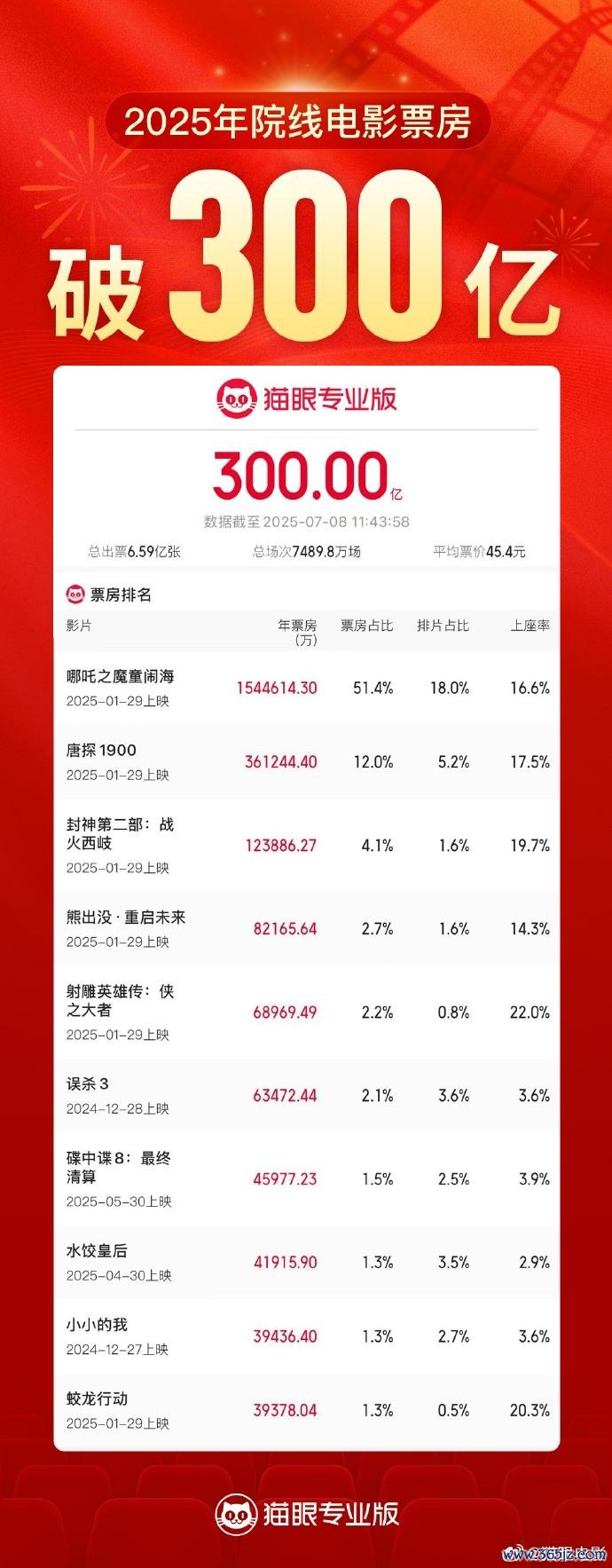 【大河财立方消息】据猫眼专业版数据,2025年7月8日11时43分,2025年度票房(含预售)破300亿,快于2024年28天到达,年度票房榜前十电影中国产电影占9部,《哪吒之魔童闹海》《唐探1900》《封神第二部:战火西岐》分列年度票房榜前三位,其中《哪吒之魔童闹海》年度票房占比超51%持续领跑。
