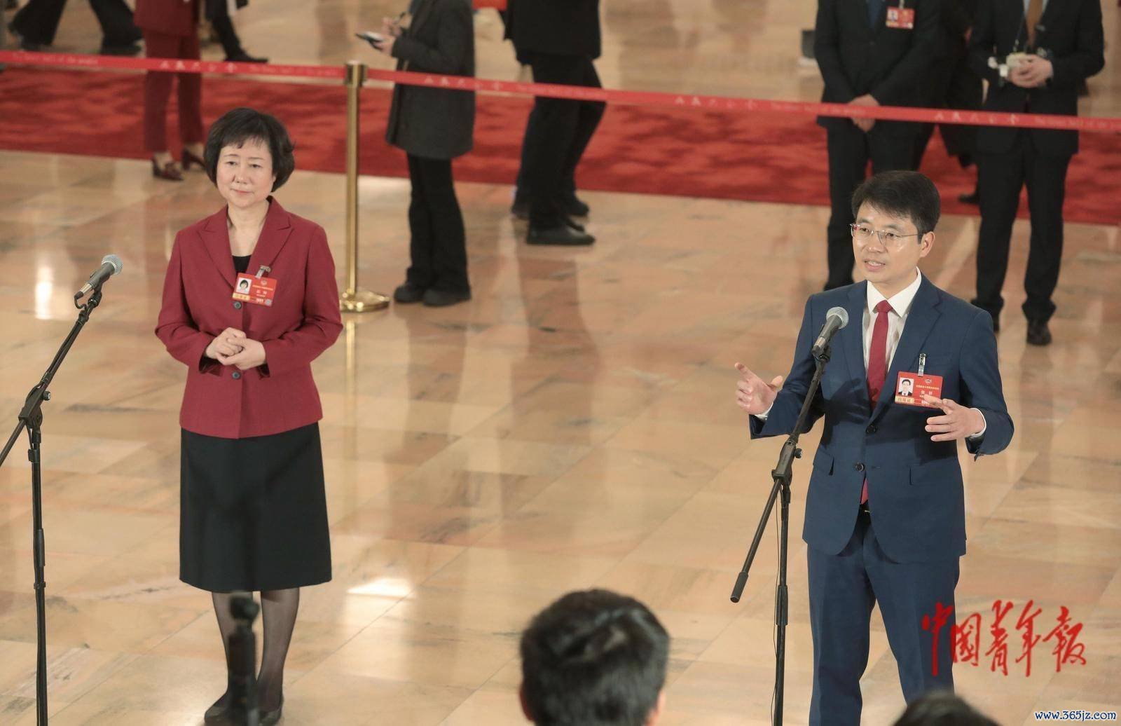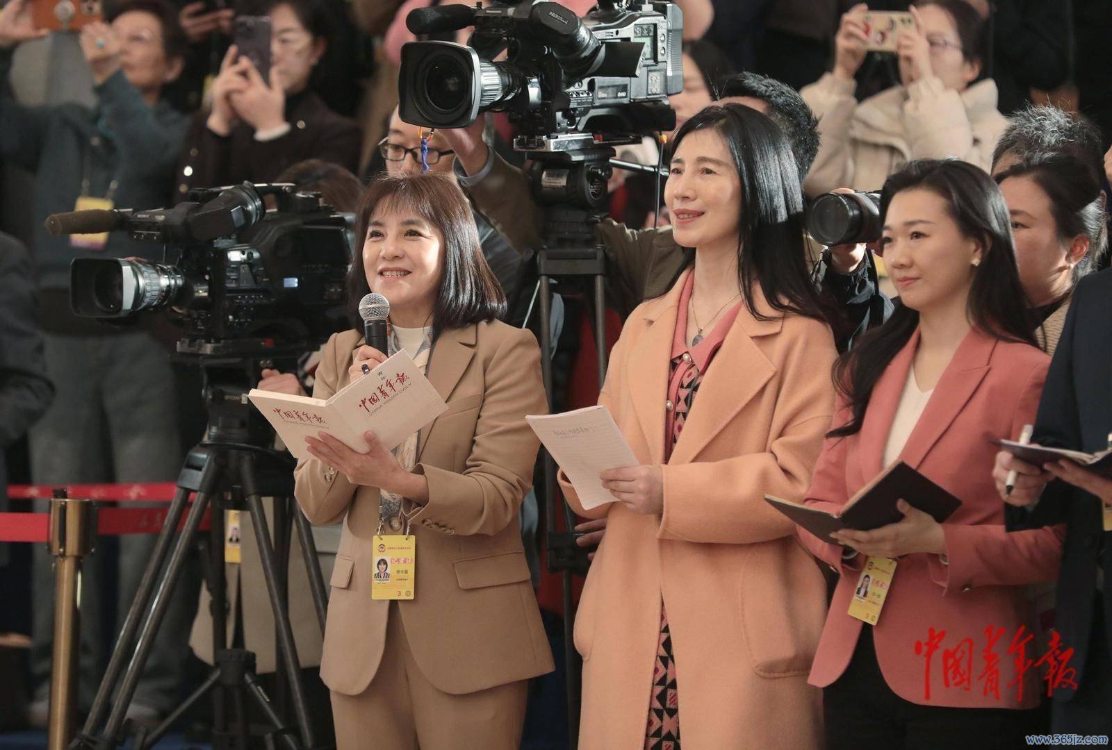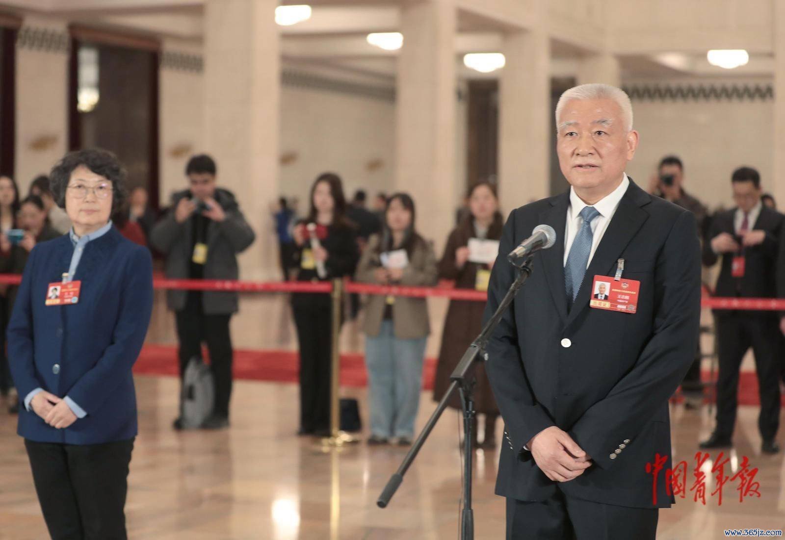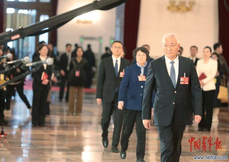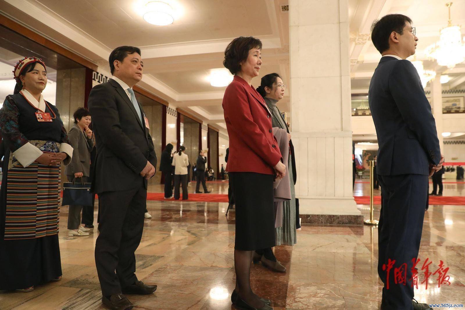 3月7日,北京,人民大会堂,全国政协十四届四次会议第二场“委员通道”集体采访活动,(右起)全国政协委员、苏州大学校长张桥,全国政协委员、中国社会科学院美国研究所研究员赵梅,全国政协常委、正泰集团董事长南存辉和全国政协委员、西藏藏医药大学教授明吉措姆等在“委员通道”等候区等候。中青报·中青网记者 陈剑/摄