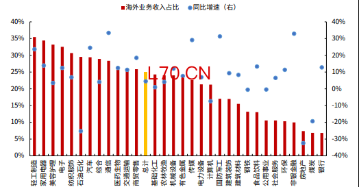 图:2025年上半年申万一级行业海外业务收入占比及同比增速
