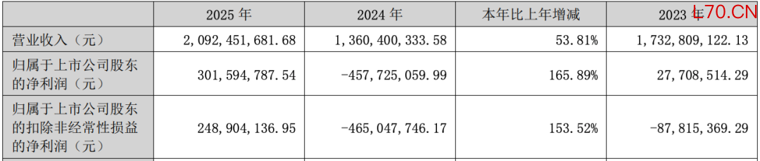 报告显示,2025年公司实现营收20.92亿元,同比增长53.81%;实现净利润3.02亿元,较2024年亏损4.58亿元,同比大幅增长165.89%。