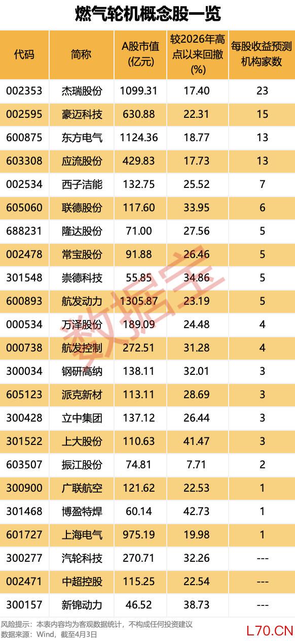 元股证券:ygzq.hk据数据宝统计,机构关注度方面,共有20只燃气轮机概念股获得机构“积极型”评级(含买入、增持、强烈推荐等)。杰瑞股份、豪迈科技、东方电气、应流股份、西子洁能等获机构评级数量靠前。