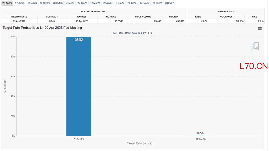 芝加哥商品交易所(CME)“美联储观察”工具显示,目前,市场认为美联储在4月28至29日联邦公开市场委员会(FOMC)会议上加息或降息的概率基本为零,且有超80%的概率美联储会在今年剩余时间始终维持利率不变。