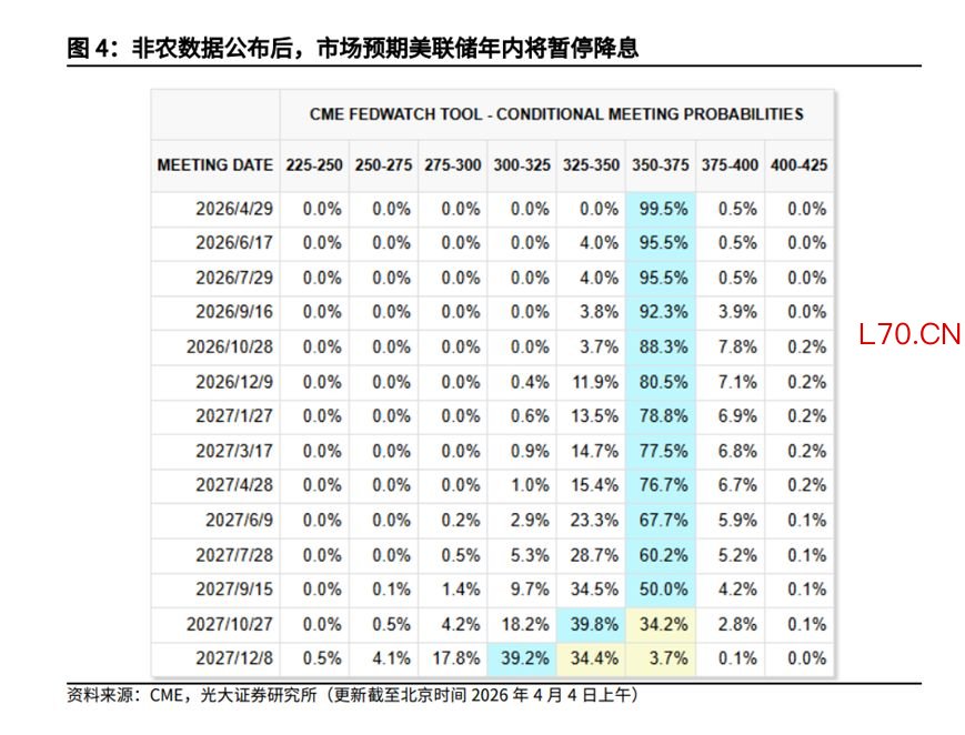 在此背景下,3月数据公布后,市场已基本抹除美联储年内降息的预期,而中东冲突爆发前市场一度定价55个基点的宽松预期。