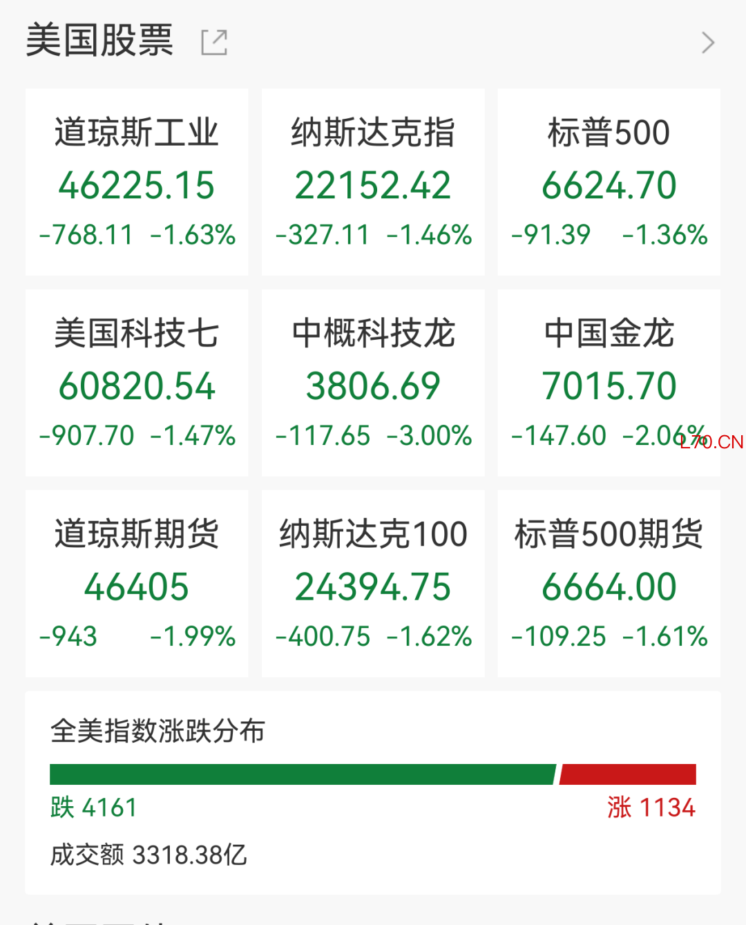 元股证券:ygzq.hk周三(3月18日),美国三大股指全线收跌,结束两连涨。道指跌1.63%,报46225.15点,跌近800点;标普500跌1.36%,报6624.70点,双双收于去年11月以来新低;纳指跌1.46%。