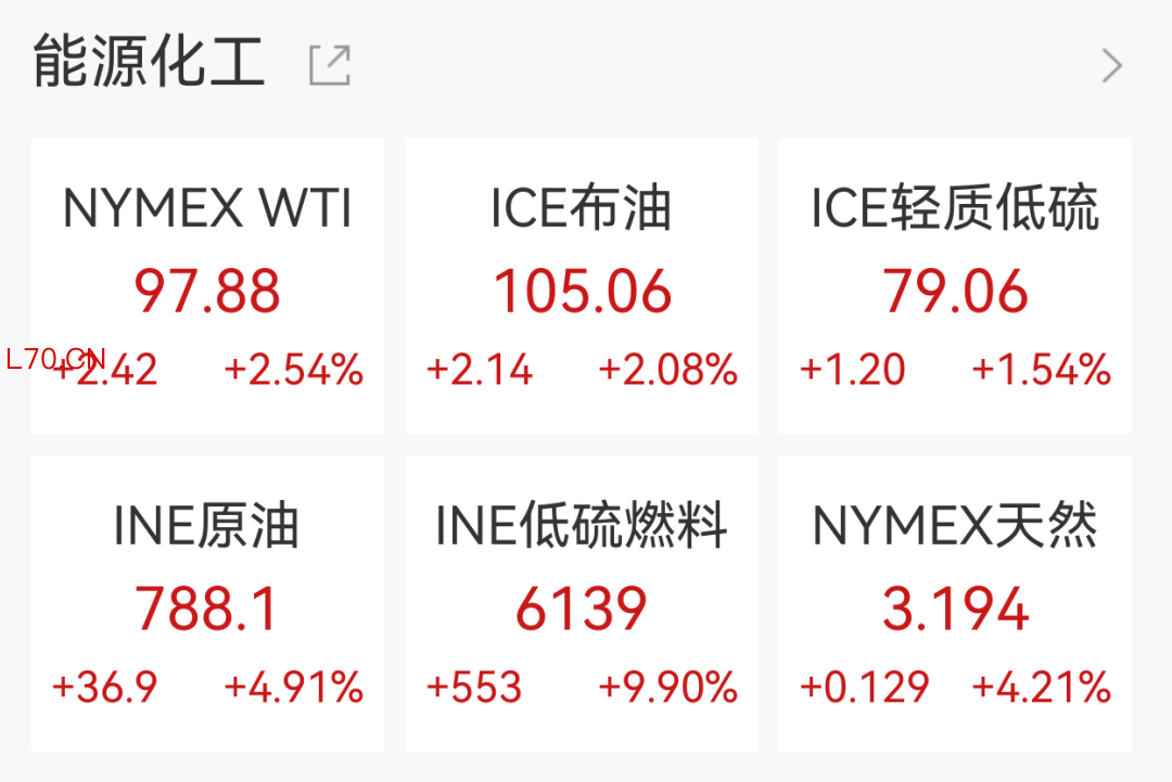 国际油价持续走高,纽约期油涨2.54%,报97.88美元/桶,布伦特原油涨超2%报105.06美元/桶。