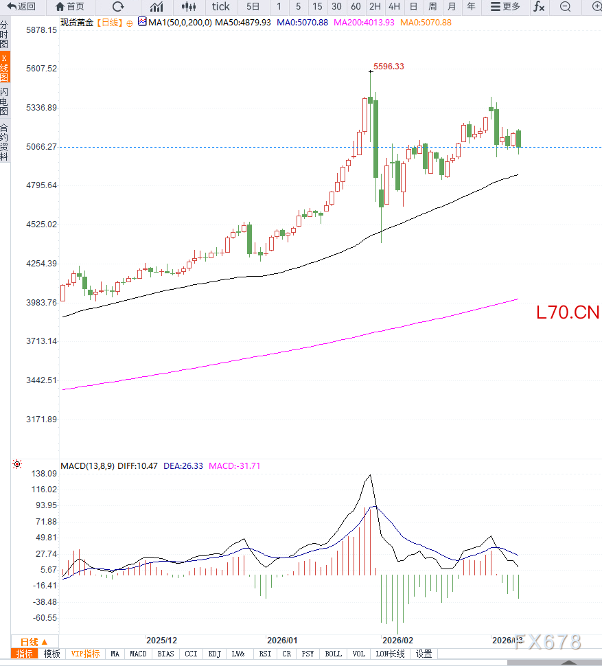 本周市场焦点:本周最受关注的经济数据将是美国消费者通胀报告。市场将密切关注即将公布的美国CPI数据。如果通胀数据高于预期,市场可能进一步推迟降息预期,从而对黄金构成压力。相反,如果通胀出现明显回落,则可能重新提振黄金需求。从技术面来看,黄金近期上涨后出现高位调整迹象。日线图显示,金价此前一度冲击历史高位,但短线出现技术性回落。关键技术位置:第一支撑:5000美元,第二支撑:4950美元。上方阻力:5100美元,强阻力:5200美元。