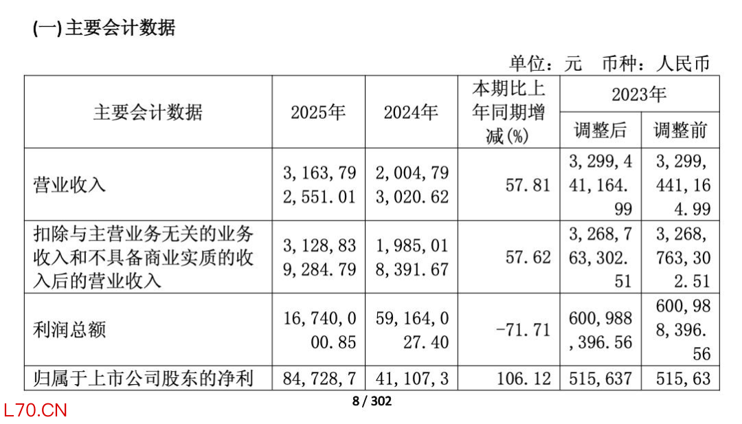 其年报显示,该公司2025年实现营业收入31.64亿元,同比增长57.81%;归母净利润8473万元,同比增长106.12%;扣非净利润-998.7万元,上年同期为-2813万元。