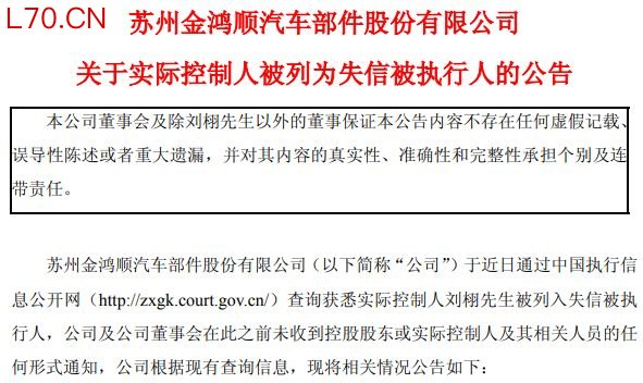 金鸿顺在公告中称,此次失信主要是因为刘栩与胡正东、泰顺县桃园置业有限公司存在合同纠纷。他因对温州汇迎科技有限公司约 9961.13万元的债务承担连带清偿责任,且全部未履行,因而被浙江省泰顺县人民法院列为失信被执行人。