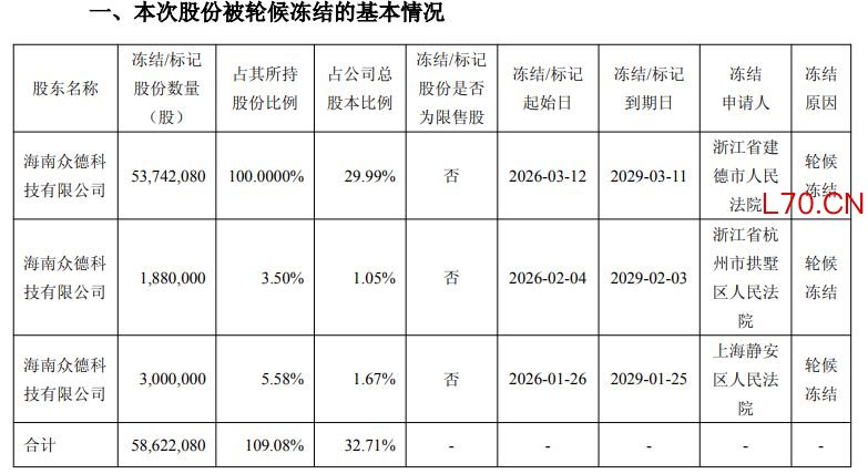 就在上个月(2026年3月16日),金鸿顺再发公告,海南众德所持股份又新增了三笔司法轮候冻结(涉及建德市、杭州市拱墅区等地法院)。截至目前,海南众德持有的全部公司股份均已处于质押、司法标记、司法冻结及轮候冻结状态(冻结/标记率达100%)。